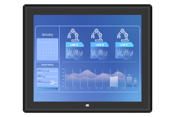 The panel PC equips four RS-232 ports and one RS-232/422/485 port to connect to legacy factory machinery and devices. Automatic Flow Control (AFC) is supported via RS-485, which ensures UART buffers are never overrun so data transmission between devices can be complete without the risk of losing data.